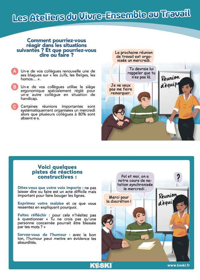 Ces Ateliers sont tout spécialement conçus pour l’animation de sessions de sensibilisation sur le sujet du Vivre-Ensemble au Travail. Par la diversité des thèmes abordés, ils offrent la possibilité d’ouvrir le dialogue sur des sujets souvent délicats et de rappeler l’importance du respect de certains principes fondamentaux d’action au travail (mais d’ailleurs aussi plus largement dans la vie quotidienne !).